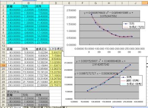 (ノ ̄∇ ̄)ノ 次に、距離と仰角の測定値で散布図(平滑線)を描いて、このグラフの近似式を求めるのニャ♪