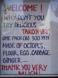 Σ( ̄□ ̄;)ここにそう書いてありますニャ!とっととたこ焼き買いますニャ!